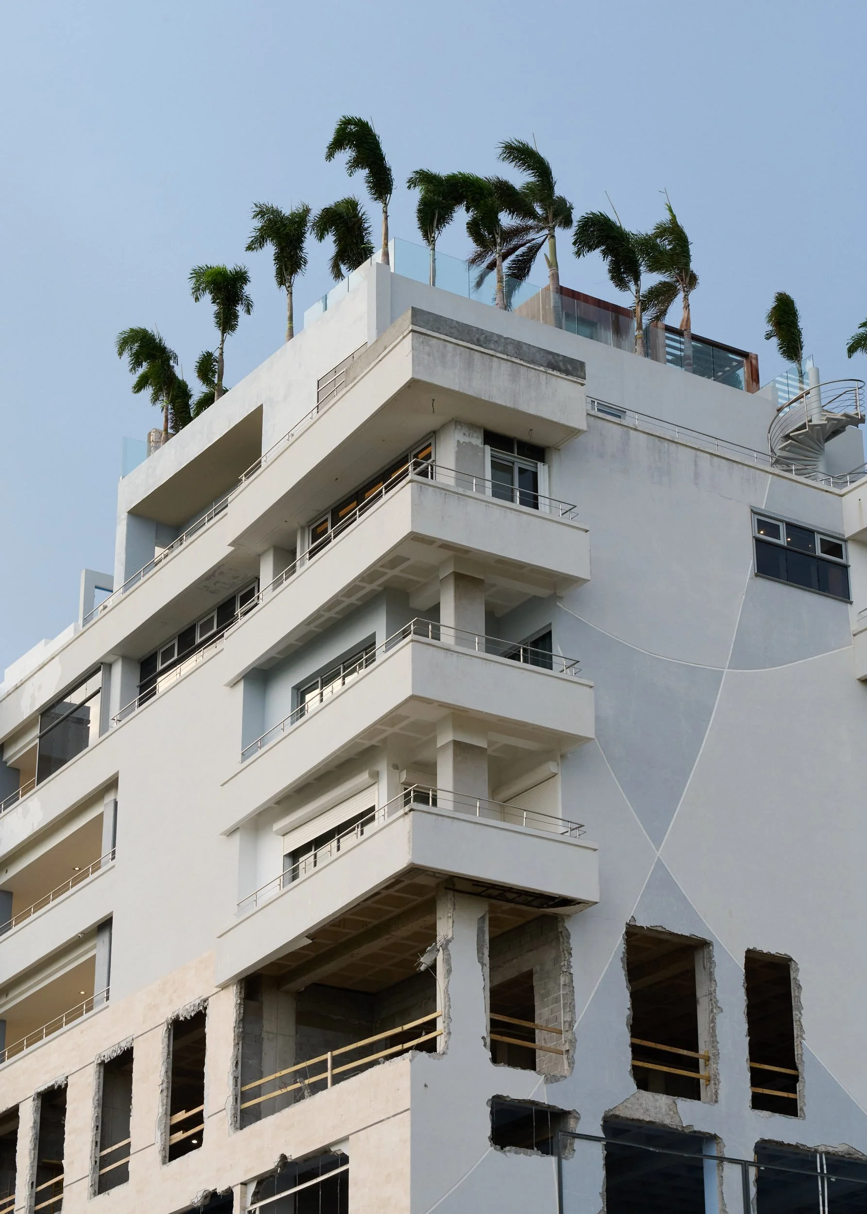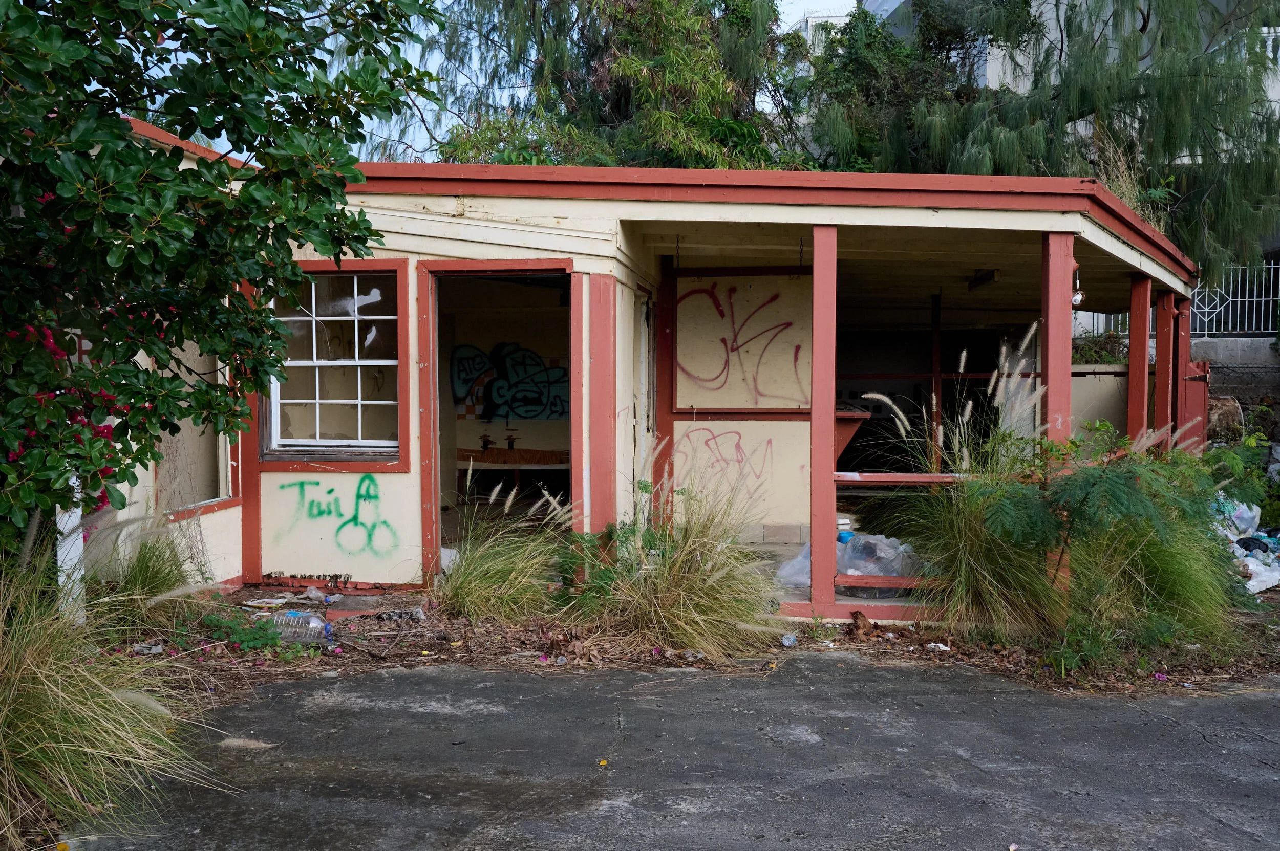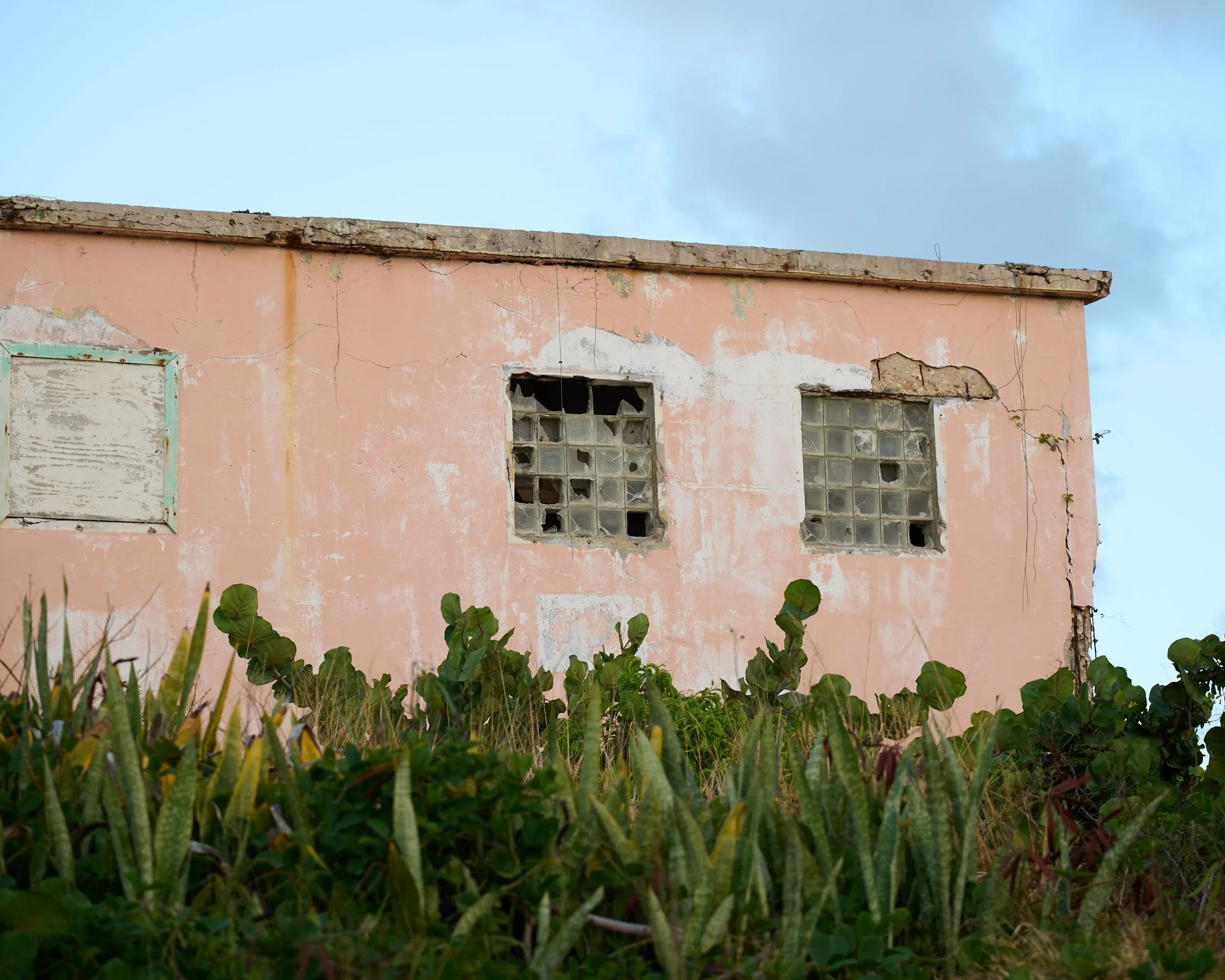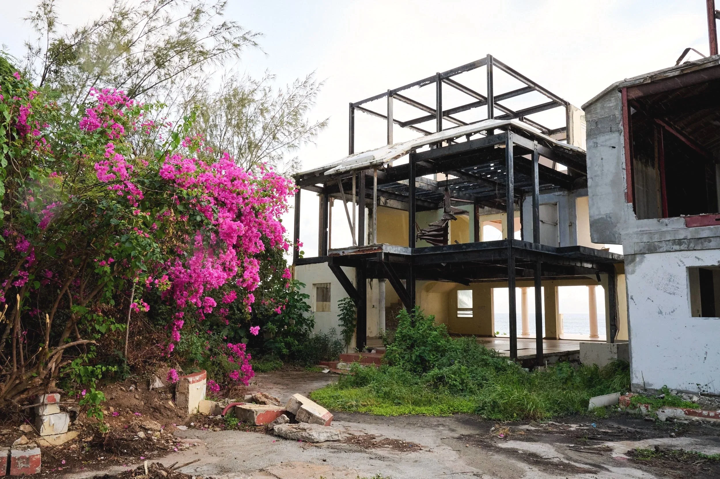 Driving around Sint Maarten, the pattern repeats itself block by block. An immaculate colonial villa with manicured hedges sits across from a gutted hut overtaken by weeds. A high-rise near the waterfront shows occupied luxury balconies with rooftop palms on its upper floors, and raw concrete, hollow frames, and years-old scaffolding at street level. A small yellow building with red trim, once a home or a shop, has been swallowed by overgrowth and graffiti, its door gone, trash in the yard. The house beside it looks like it was painted last week.